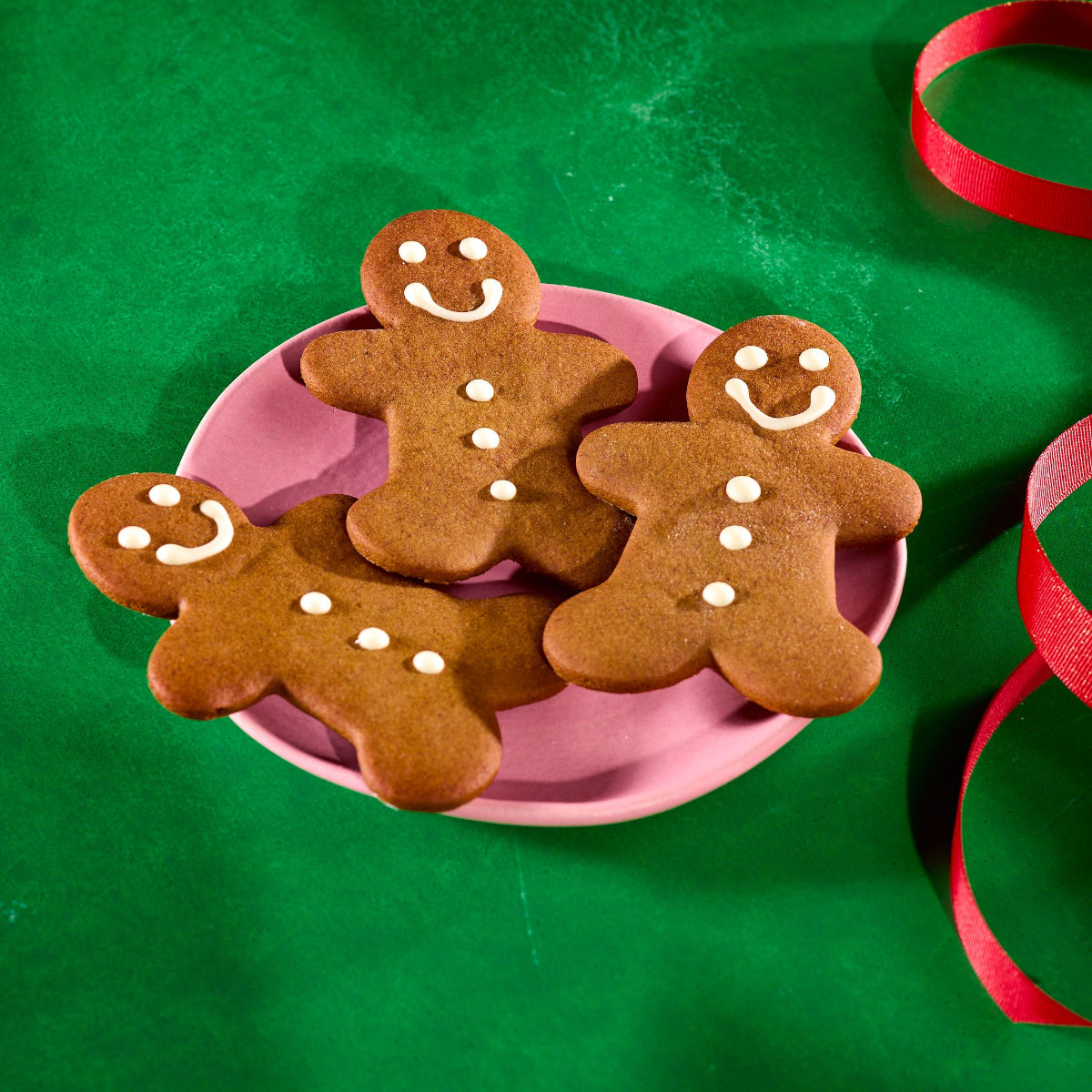 Gingerbread cookies shaped like boys. Decorated with white fondant faces.