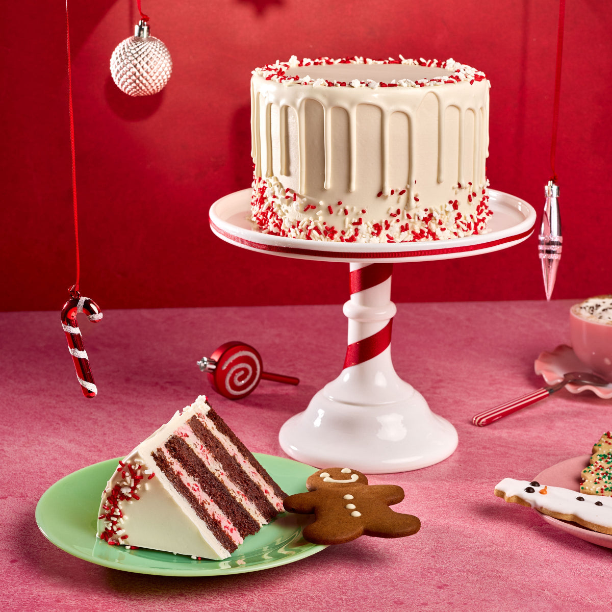 Devil's food chocolate cake filled with a peppermint cream filling. Topped with buttercream, crushed peppermint, and festive jimmies.